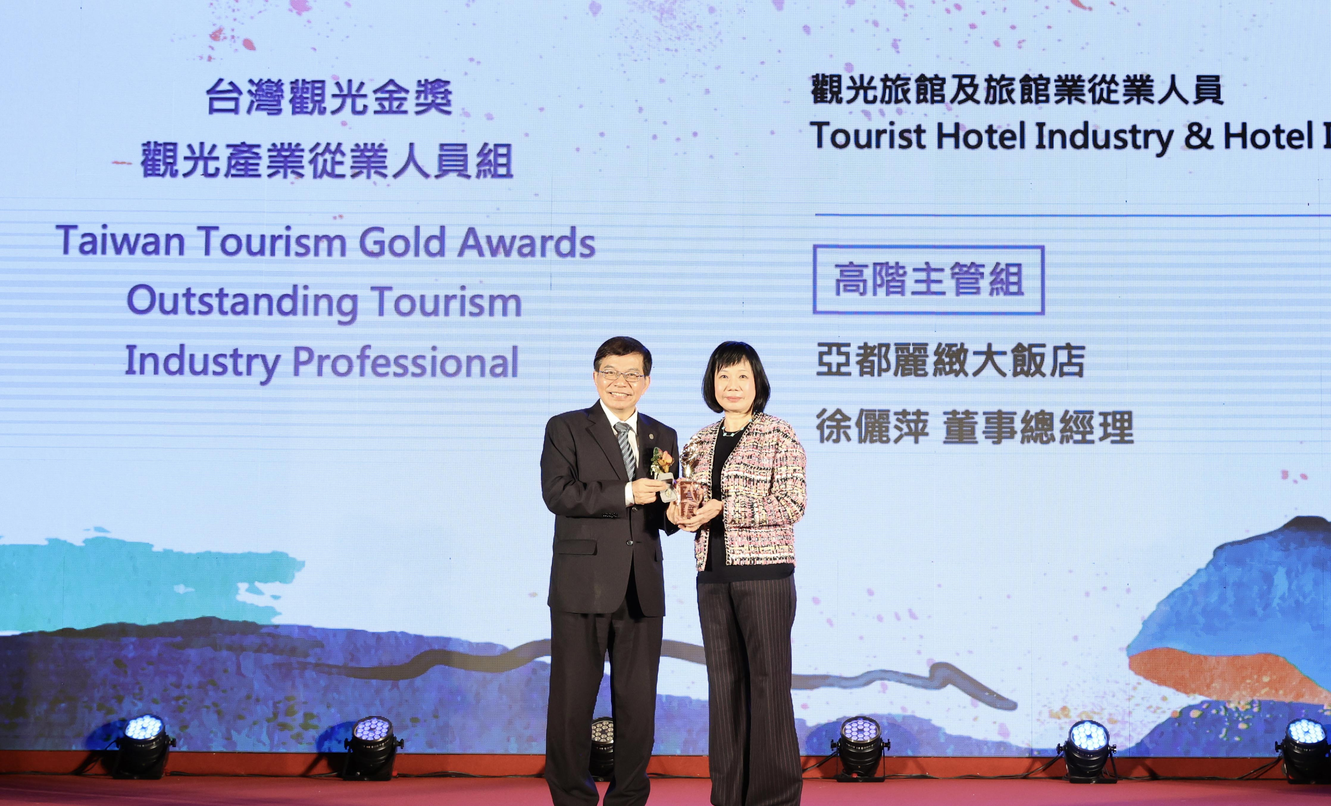 麗緻餐旅集團 董事總經理兼集團總經理 徐儷萍榮獲象徵飯店人終身成就獎的「第1屆台灣觀光金獎」,肯定其多年來領導集團,步步呈為今日的傑出的團隊與自己。