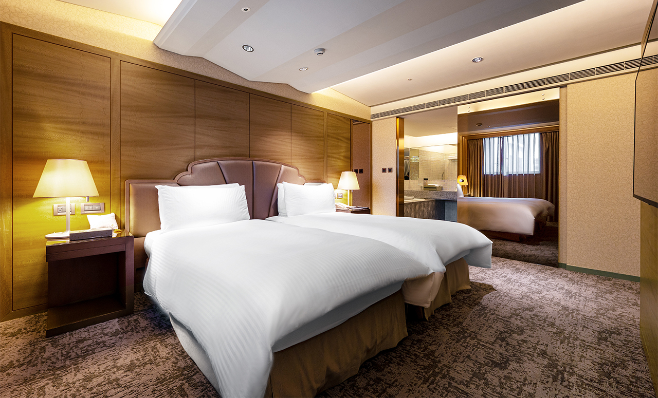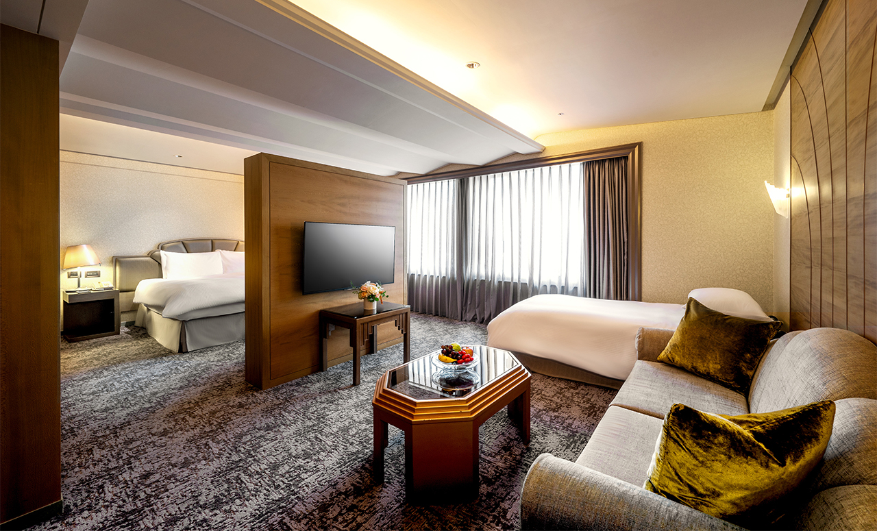 低調內斂設計、寬敞舒適的空間,營造優雅氛圍。King Size大床與舒適沙發,舒緩一天疲累,另可擴併隔鄰客房,組成家庭套房,享有更舒適寬敞的空間。